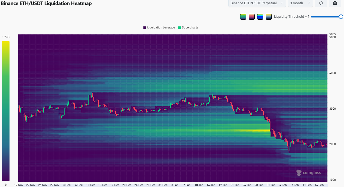 The 3-month liquidation heatmap revealed that a sizeable cluster of liquidations was building up in the $3.4k-$3.8k. This was too far away to be immediately actionable to traders. More locally, there were two magnetic zones building up around $1.55k-$1.7k and $2.15k-$2.55k.