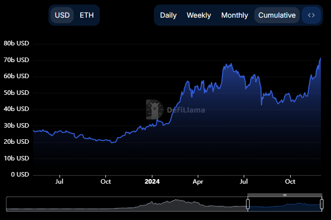 Recent data from DeFiLlama showed a significant surge in Ethereum’s Total Value Locked (TVL), which has climbed to $71.575 billion. This marks its highest level this year and a peak last seen in 2022.