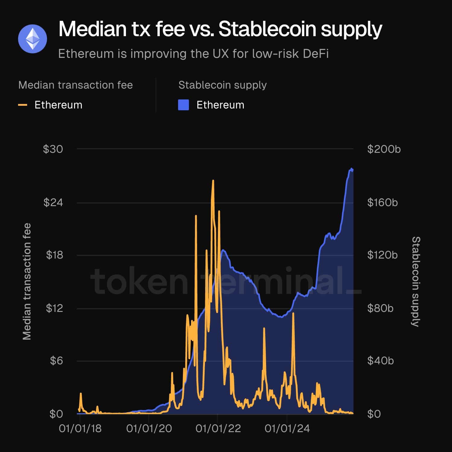 This jump is part of a bigger trend: Median Transaction Fees on Ethereum have dropped to near-zero levels, even as Stablecoin Supply on the network climbed above $180 billion. Low costs plus rising liquidity have pushed capital velocity on Ethereum to an all-time high, especially in low-risk DeFi.