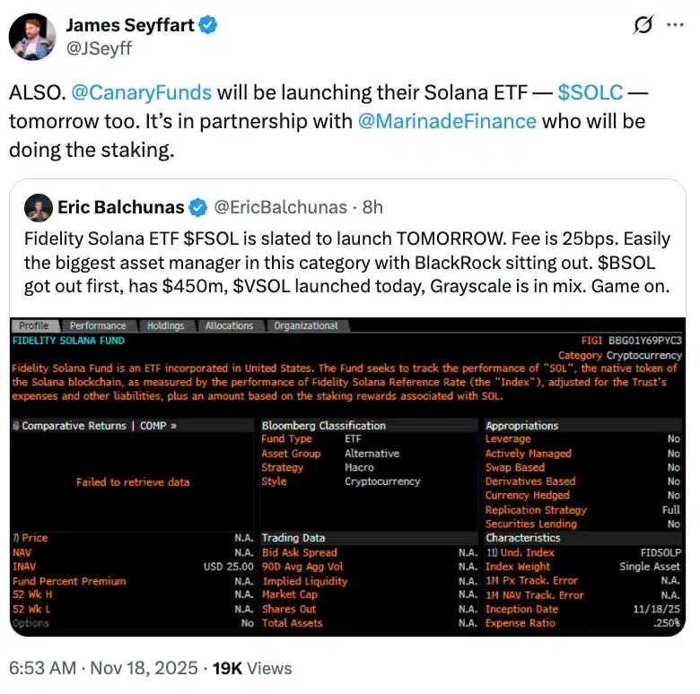 This time, it’s Fidelity and Canary Capital stepping into the spotlight with the upcoming launch of the Fidelity Solana ETF (FSOL) and Canary Marinade Solana ETF (SOLC), both set to debut on the 18th of November.