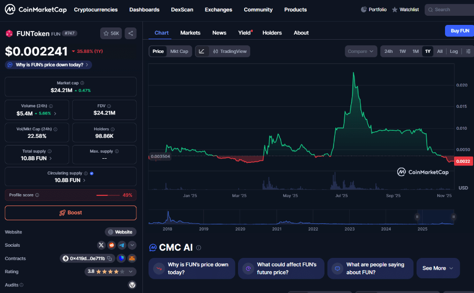 Today, FUNToken’s price sits near $0.002225, with a market cap of around $24.38 million and nearly 99,000 active holders, according to CoinMarketCap.