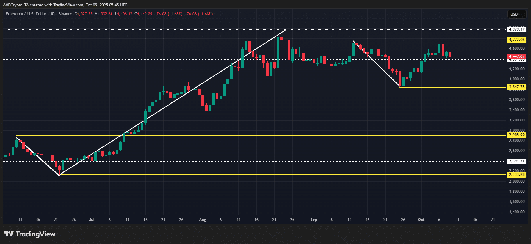 In under 72 hours, ETH has pulled back 2.7% from $4,756, marking its second rejection at the $4.8k ceiling. Previously, ETH topped at $4,766 on the 13th of September, which triggered a 20% pullback over two weeks.