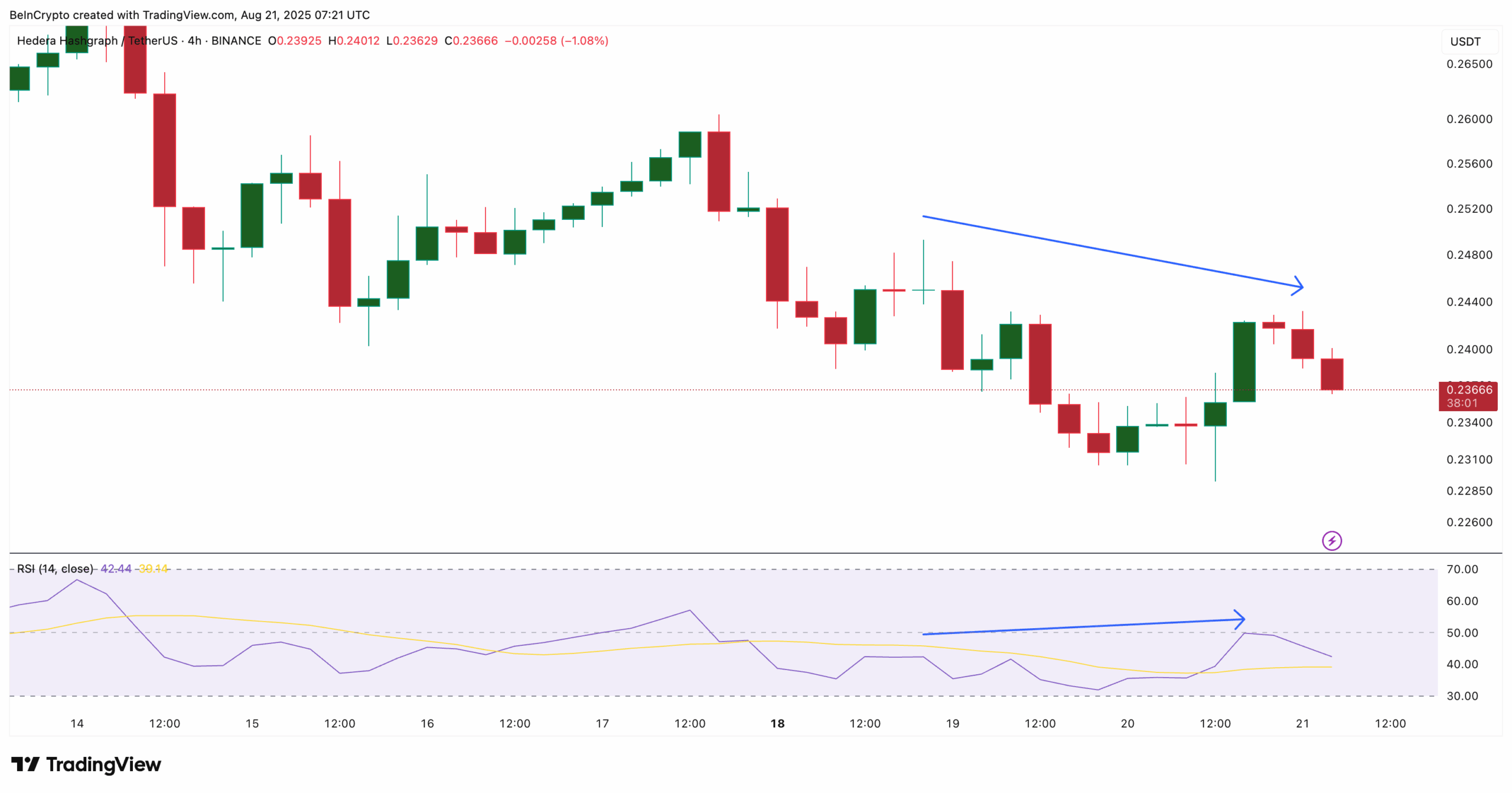 Between August 18 and August 20, the HBAR price formed a lower high, but the RSI climbed higher during the same period. This divergence usually hints that buying momentum is attempting to return — at least in the short term — even as the price struggles to break resistance.