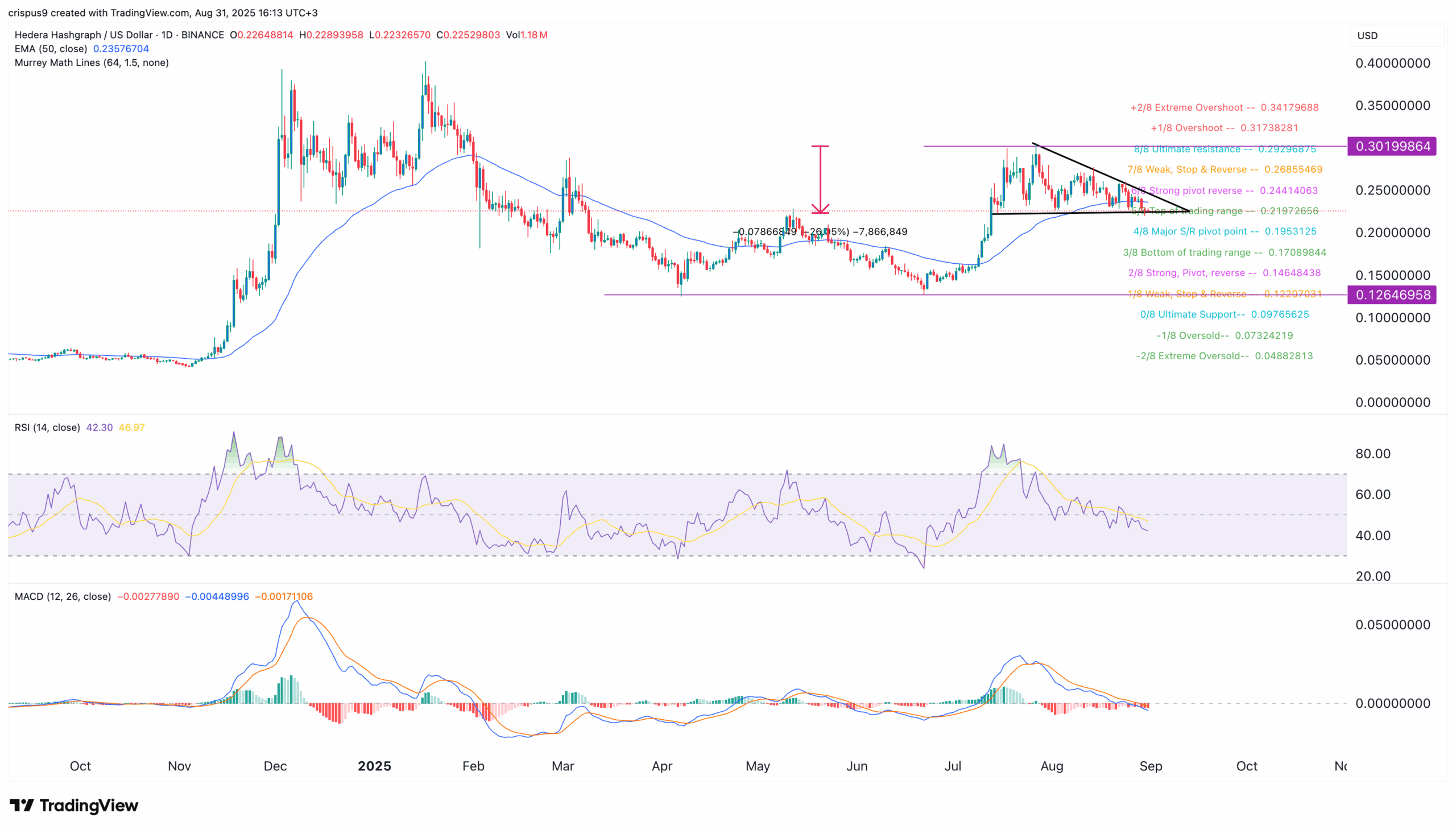 The daily timeframe chart shows that the HBAR price has been in a downtrend in the past few weeks, moving from a high of $0.3020 in August to $0.2232.