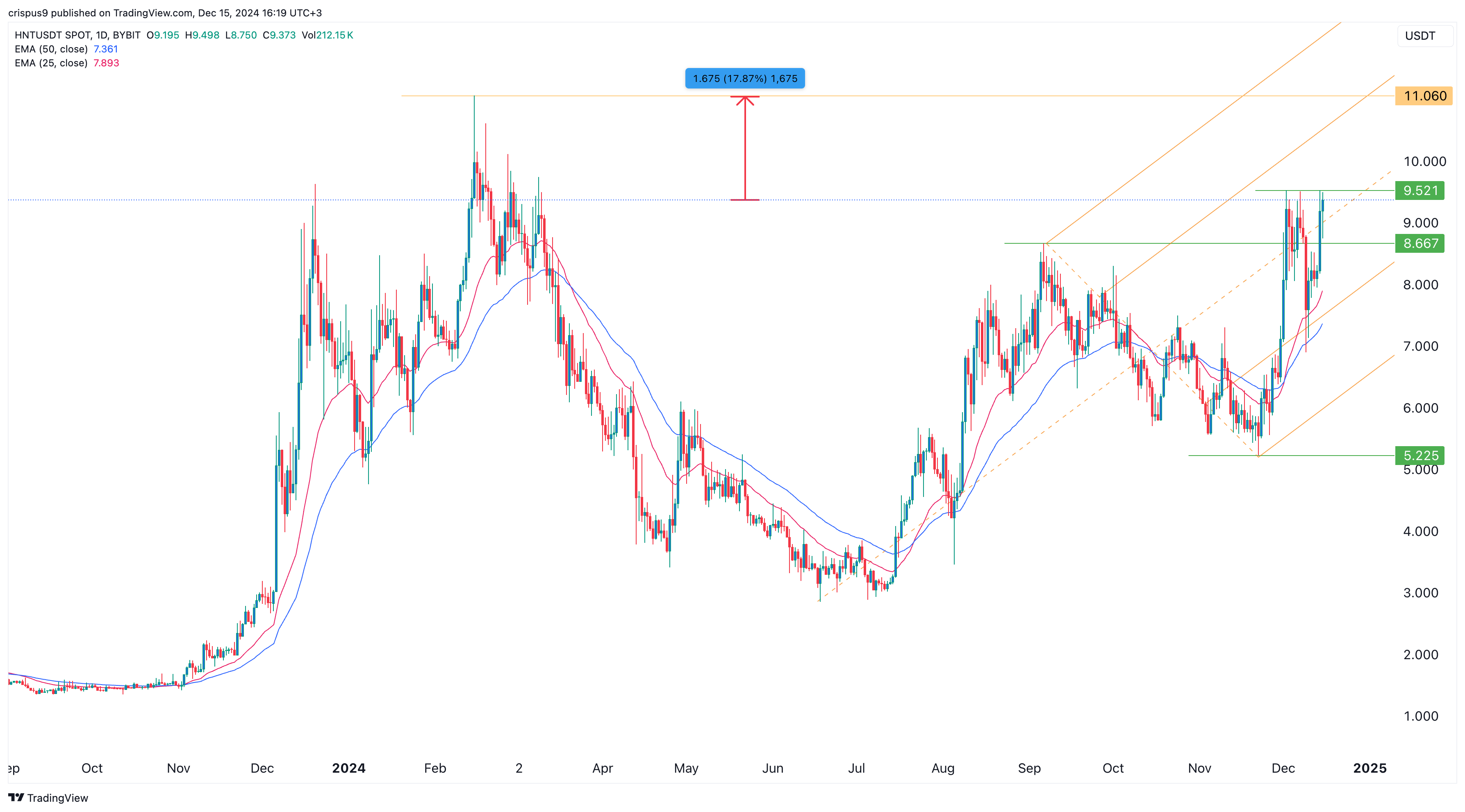 Helium (HNT) jumped to the crucial resistance level at $9.520 on Sunday, Dec. 15 as the recent rally gained steam. It has soared by 228% from its August lows, pushing its valuation to $1.6 billion.