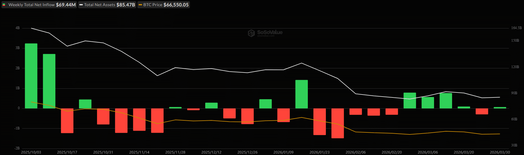 Farside Investors’ data showed that Bitcoin ETFs saw positive flows on Monday, the 30th of March, as BTC fell to the swing low at $65.6k.
