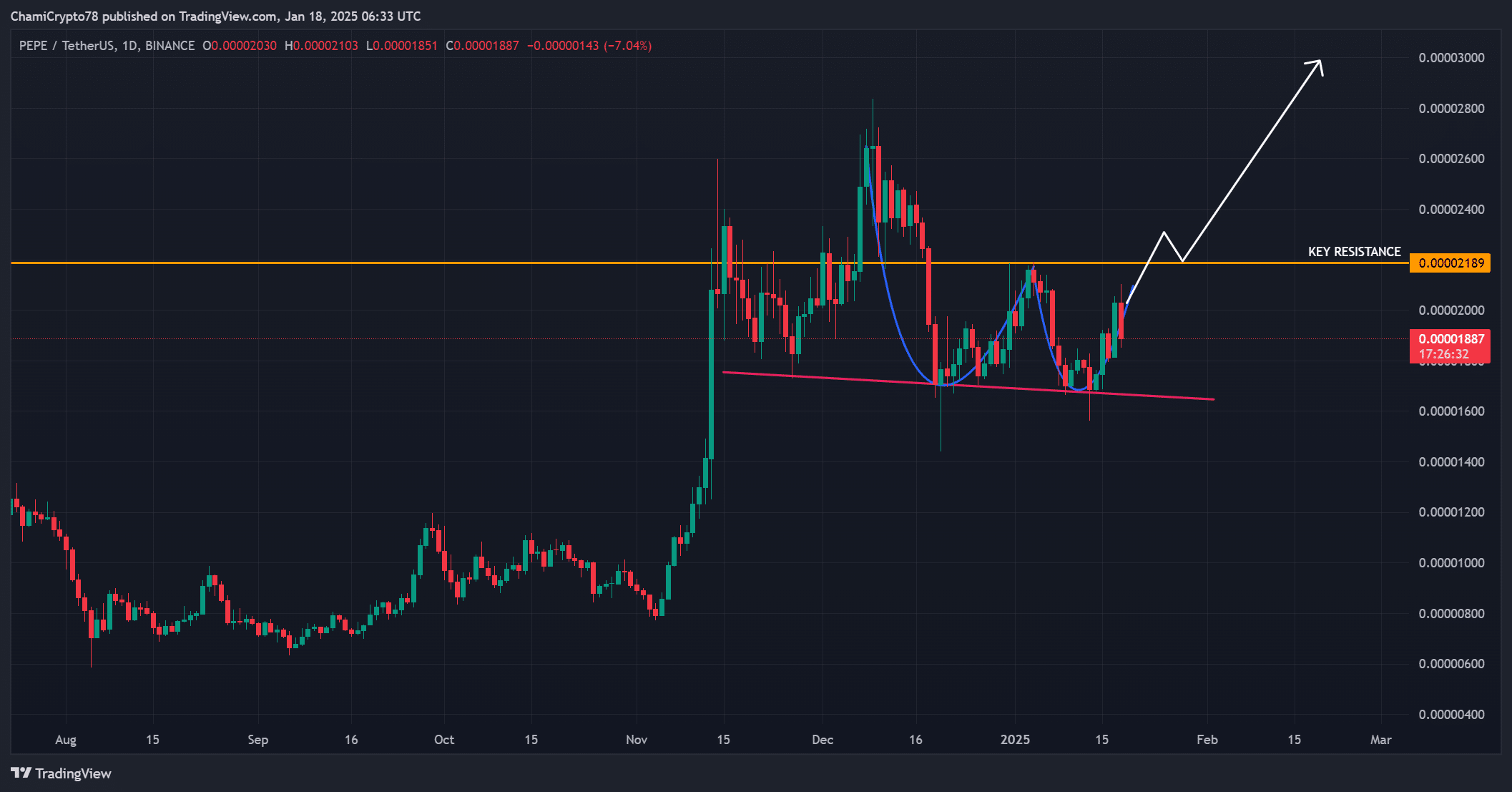 - Whale investment and a cup-and-handle pattern hinted at potential bullish momentum for PEPE