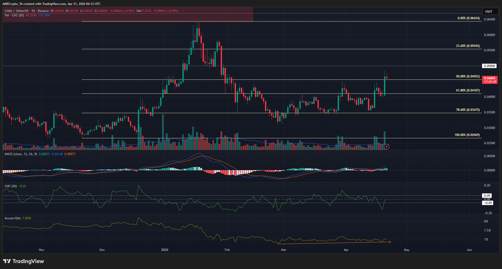 From a price action standpoint, Chiliz had a healthy outlook on the higher timeframes. The rally in January reached $0.064 and spent the next two months retracing these gains. Since March, the bearish tides have been stemmed.
