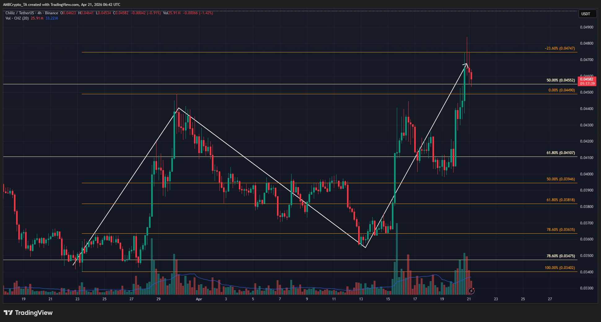 A sustained rally beyond $0.048 is possible, but the risk-to-reward ratio does not justify buying CHZ right now, as a chunk of the move is over. Waiting for a retest of $0.038-$0.04 would be more ideal.