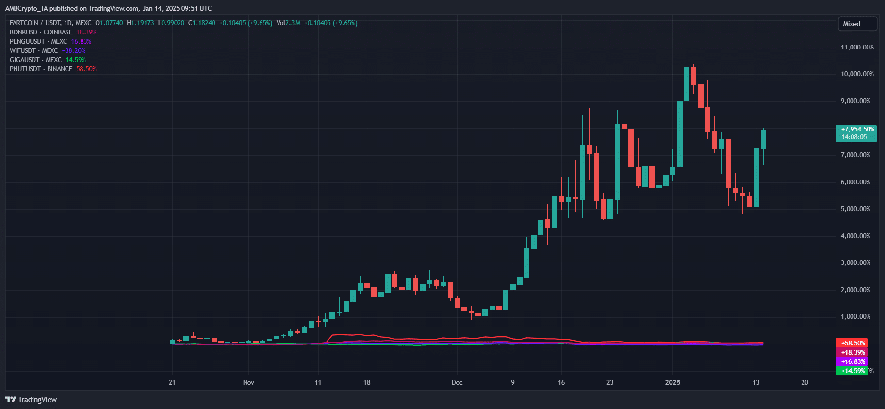 The last few weeks have been a volatile period for Solana-based memecoins. FARTCOIN, in particular, has demonstrated dramatic price action, surging by over 7,900% before experiencing a sharp correction. In fact, its latest rapid rally came after a period of significant decline – A sign of heightened speculative interest.