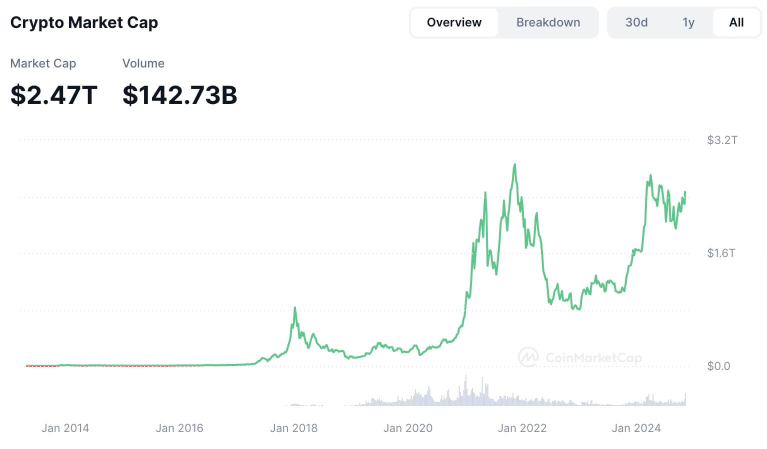 The crypto market cap is approaching $2.5 trillion, following Bitcoin’s all-time high. Source: CoinMarketCap