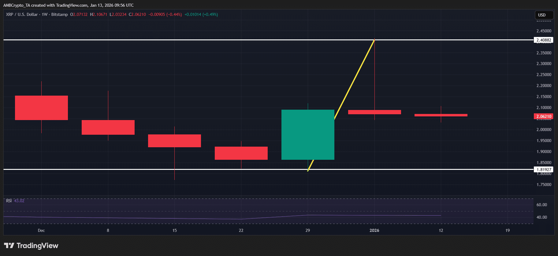 CoinMarketCap data showed XRP down roughly 11% on the week, making it the weakest performer among top caps. Overhead supply was clearly stacked around $2.50, where resistance held and profit-taking kicked in.