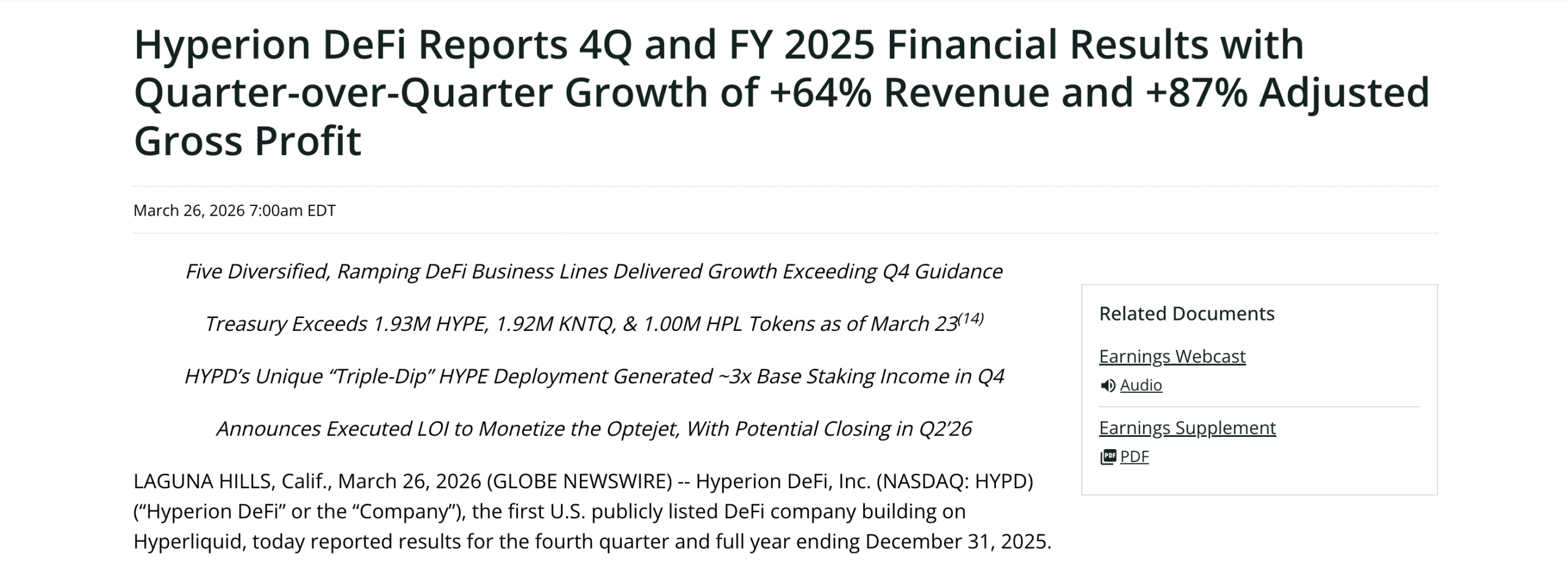 - The first U.S listed DeFi company Hyperion reported 64% revenue growth in Q4 2025 and 87% profits.