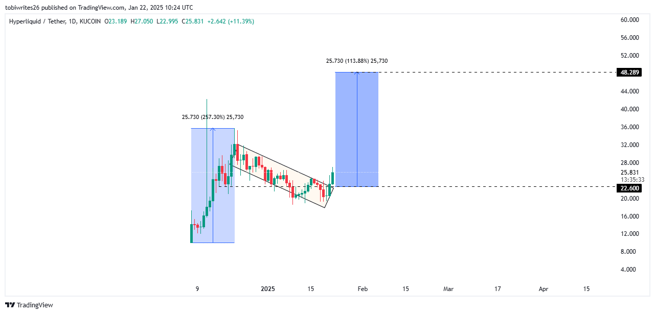If the pattern holds, HYPE could mirror its initial rally, climbing another 113.8% to approximately $48.3, setting a new all-time high.