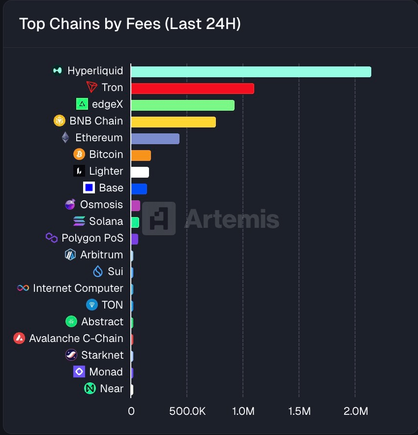Hyperliquid is also leading all chains in daily fee generation, well ahead of major players.