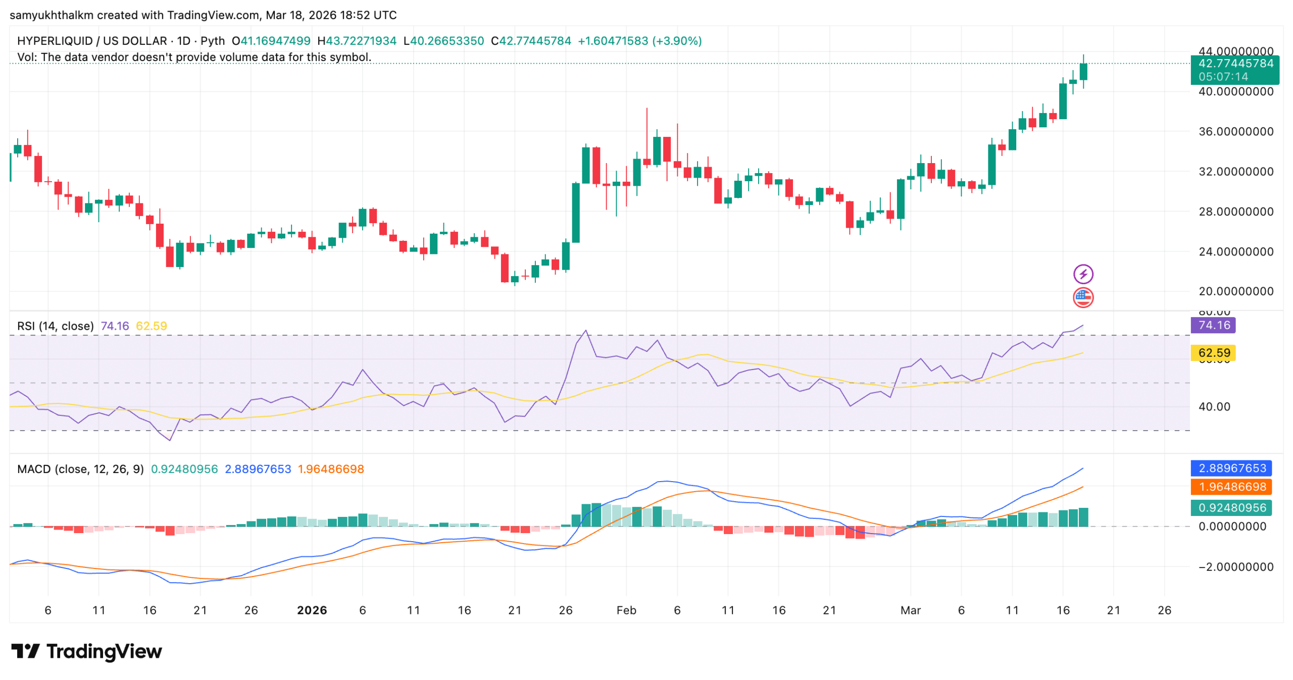 At the time of writing, HYPE had broken out of its recent consolidation range and pushed to highs near the $42-$44 zone. The RSI was elevated, so there was buying pressure… but not without short-term overbought conditions.