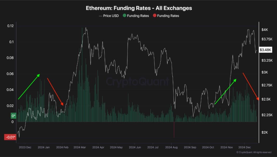 Historically, such a pattern occurred in January 2024 when the drop in funding rates cooled the futures market strengthening ETH for a major uptrend.