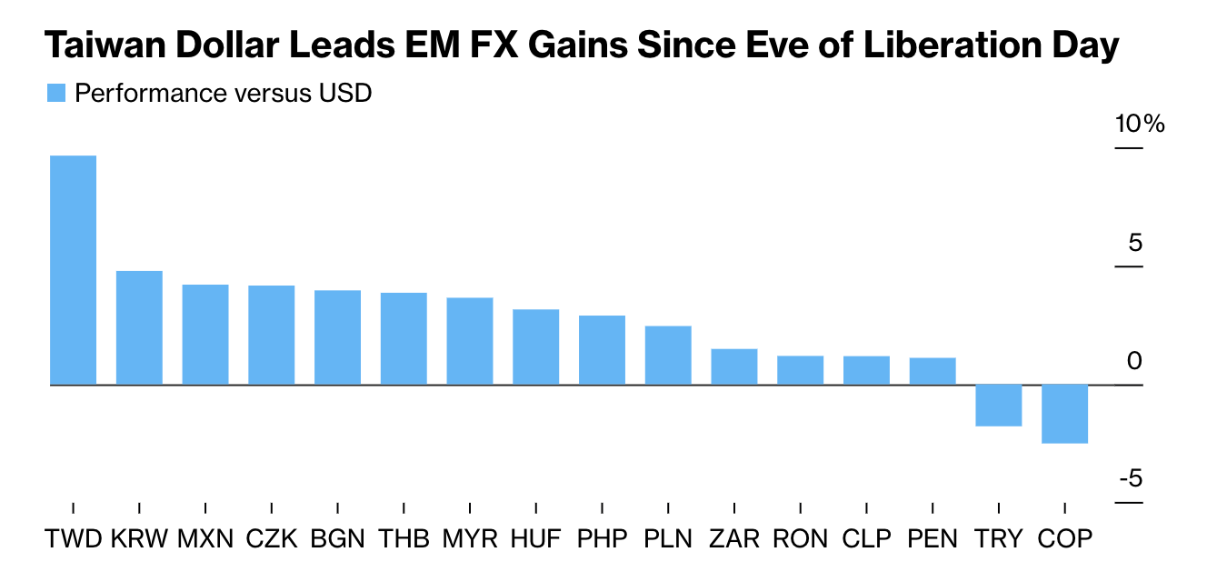 Bloomberg data shows that at least 14 different emerging market currencies have outrun the dollar since April 2nd, with the Taiwanese dollar (TWD) being the strongest performer of all.