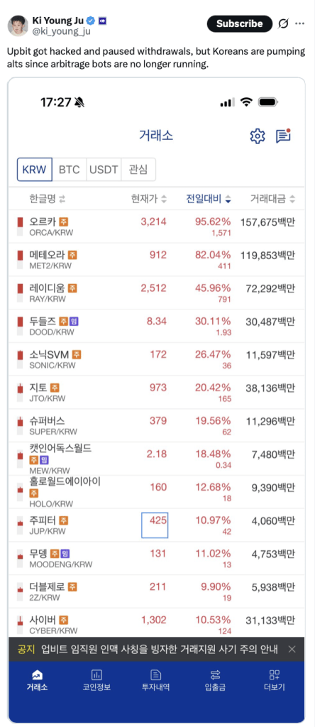 “Upbit got hacked and paused withdrawals, but Koreans are pumping alts since arbitrage bots are no longer running,” Ju said in an X post on Thursday, shortly after the exchange halted transaction activity after detecting an “abnormal transaction” with a value of around $36 million.
