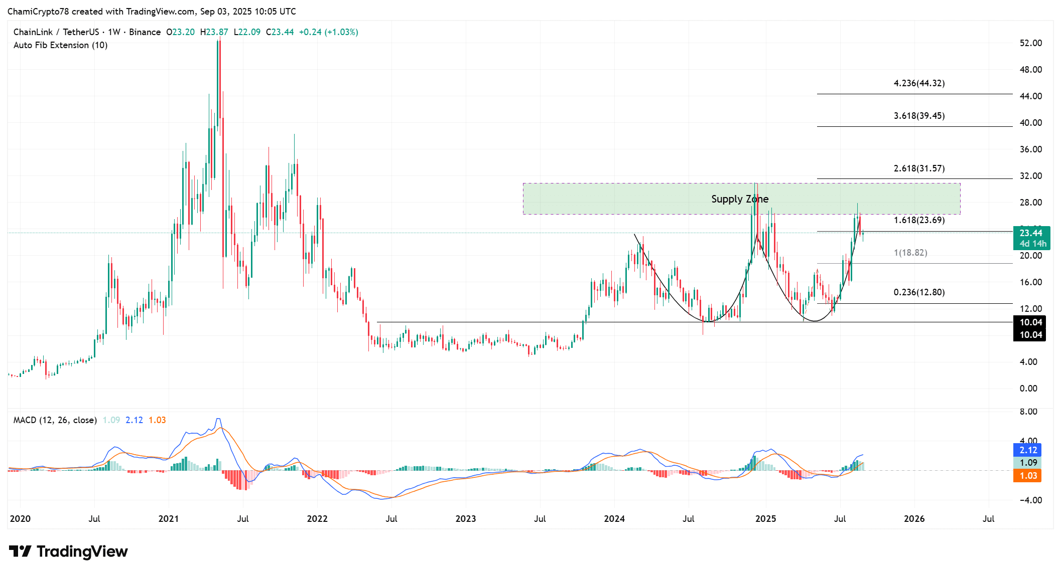 Chainlink’s weekly chart was inferred as a rounded bottom formation, suggesting a long accumulation phase followed by a bullish breakout attempt.