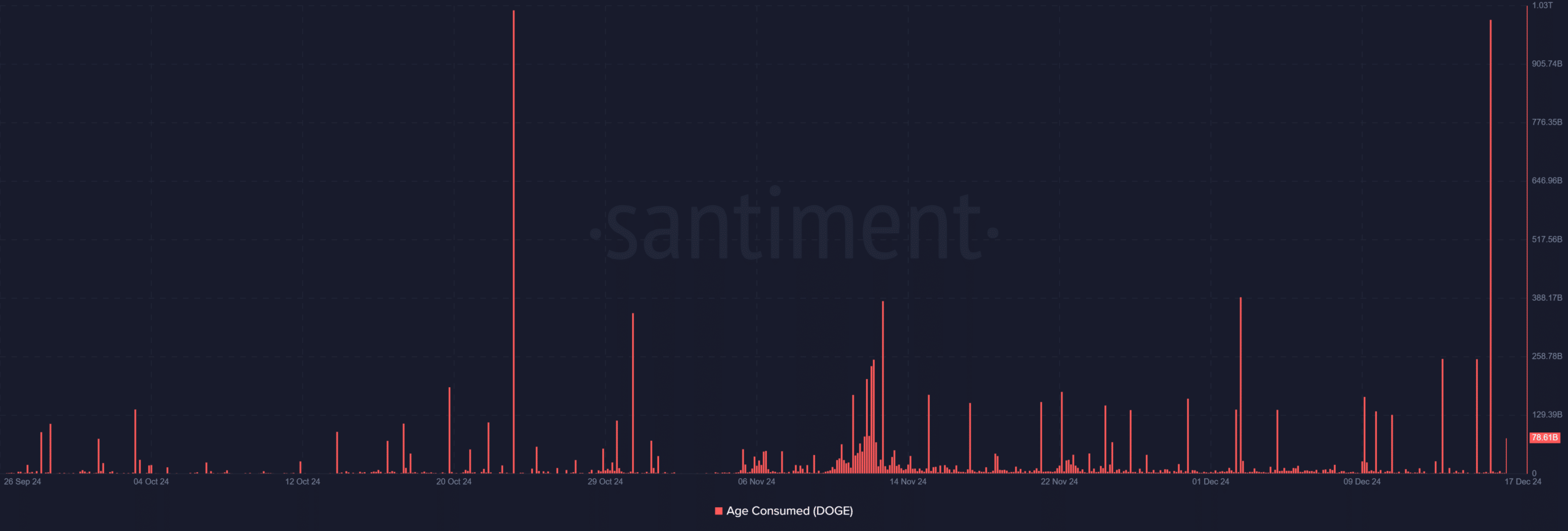 One notable trend is the spike in Dogecoin’s Age Consumed metric, which tracks the movement of long-held, dormant tokens. As seen in the Santiment’s Age Consumed chart, major spikes occurred in late October, mid-November, and December.