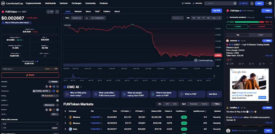 According to CoinMarketCap, FUNToken ($FUN) is currently trading around $0.002667 USD, with a market capitalization of $28.86 million and a 24-hour trading volume of approximately $14.86 million.