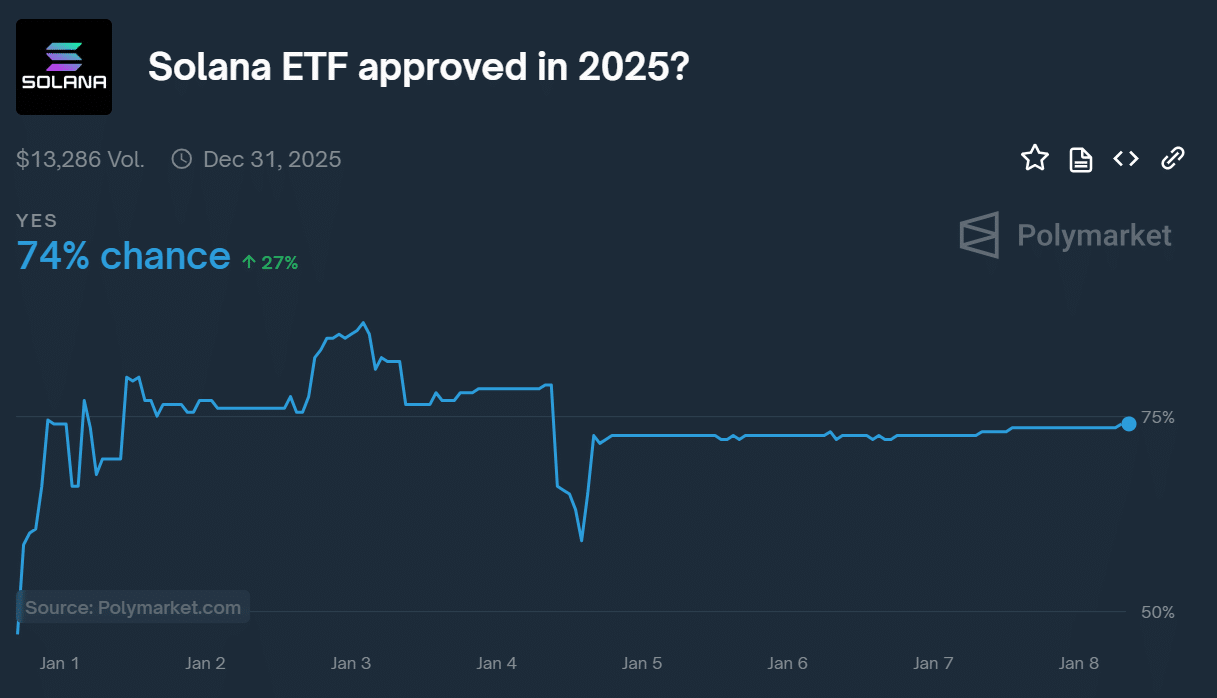 At press time, bettors on the prediction site Polymarket were pricing a 74% chance of SOL ETF approval in 2025.