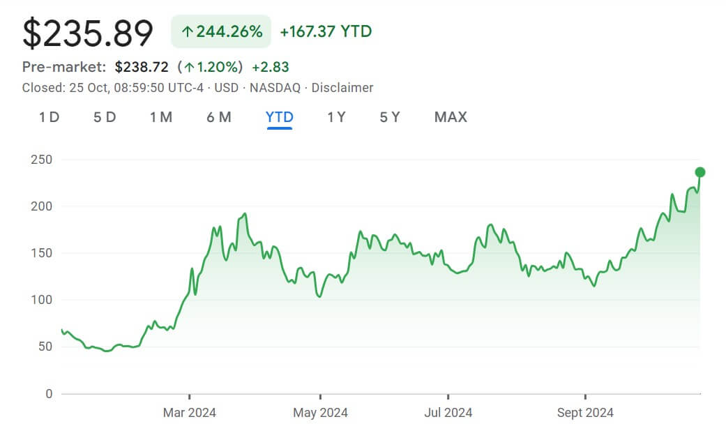 Google Finance data reveals that MicroStrategy’s stock, bolstered by its significant Bitcoin holdings, has shown consistent upward momentum throughout the year. As of press time, MSTR has soared by 244% year-to-date and climbed 55% over the past month, reaching $235.89 as of the market close on Oct. 24.