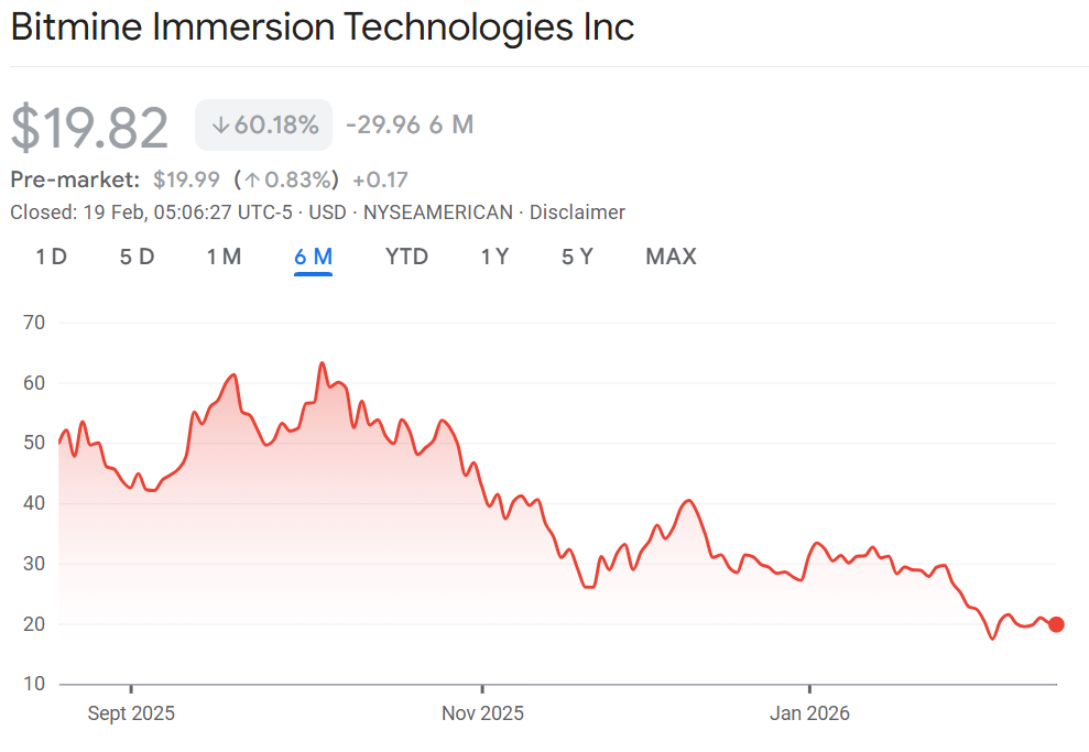The accumulation came despite a sharp drop in Bitmine’s share price. BMNR fell about 48% in the fourth quarter of 2025 and about 60% over the past six months, trading near $19.90 in premarket action Thursday, according to Google Finance.