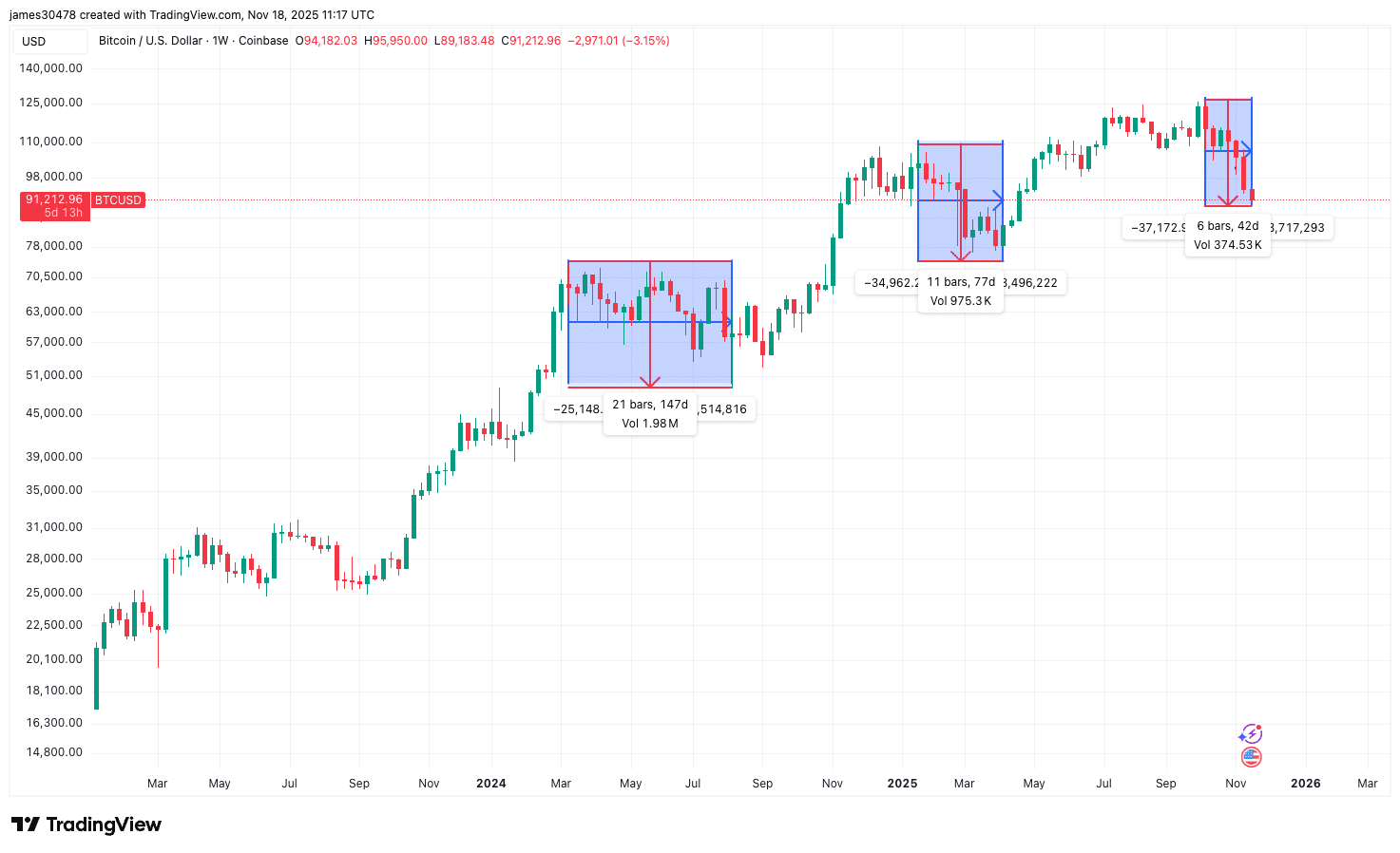 Since October, BTC has dropped by 29%, slipping from $126k to $89.2k. This marks the third time it has dropped by 30% this cycle and falls within the normal pullbacks during bull runs.