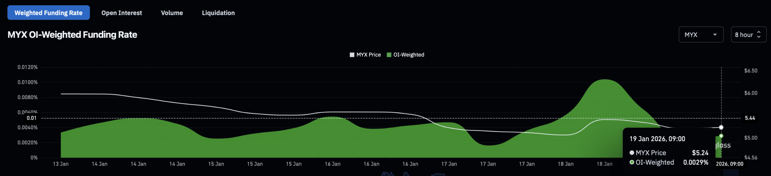 The Open Interest–Weighted Funding Rate, a metric used to gauge whether perpetual traders are leaning bullish or bearish, indicated that MYX remained skewed toward the bullish side.