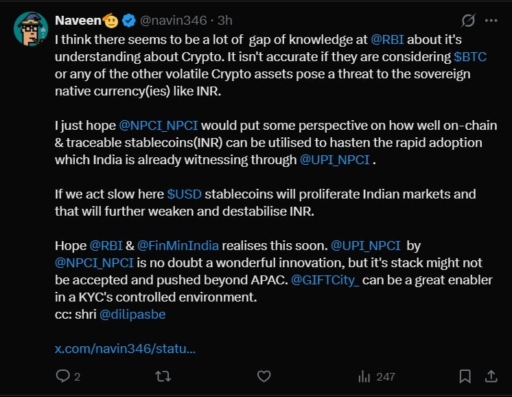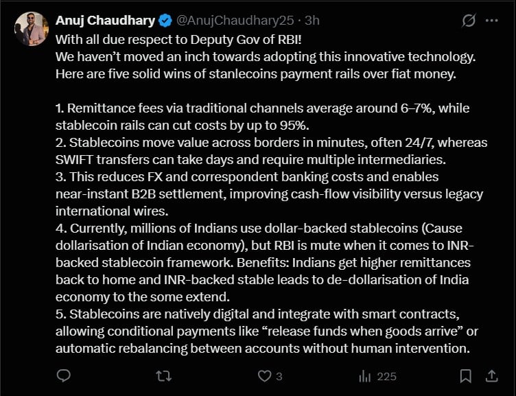 Speaking at a media event in Mumbai, RBI Deputy Governor T. Rabi Sankar made things clear. Stablecoins simply don’t pass his test of what money should be.