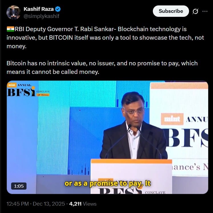 Sankar also pushed back on the idea that cryptocurrencies hold inherent value. Referring to Bitcoin’s origins, he described it as a showcase of technology rather than a true currency, adding that its value is largely speculative.