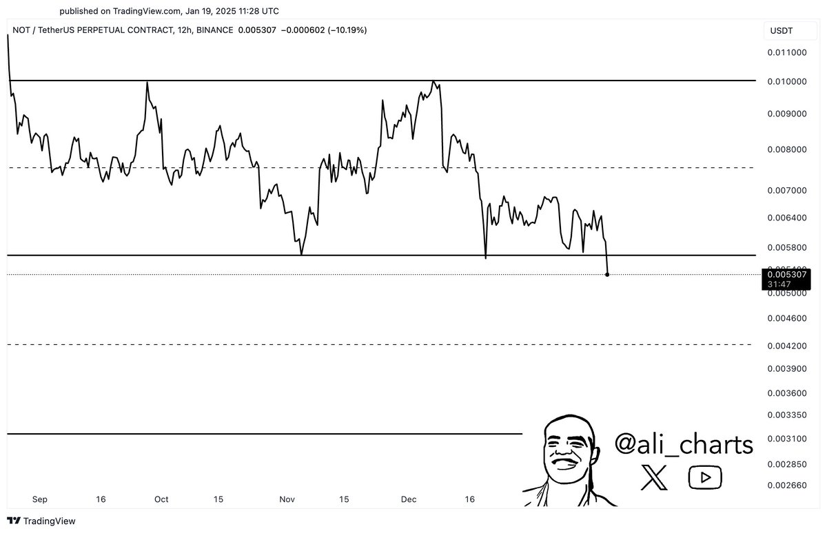 In his analysis, Martinez observed that Notcoin has broken a key support level and is now on the verge of a potential decline.
