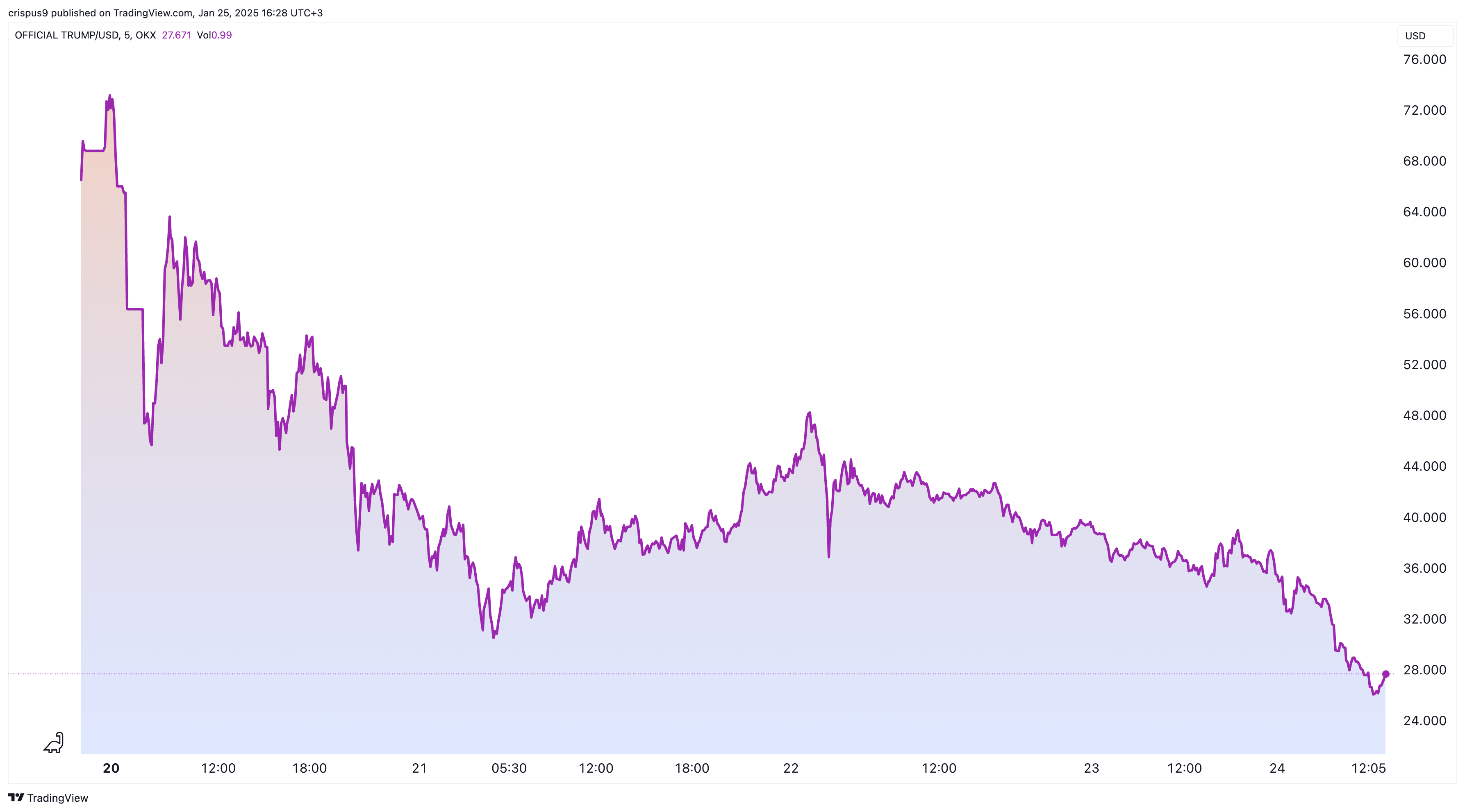 Official Trump (TRUMP) price crashed to a low of $27 on Saturday, down by about 63% from its all-time high. This plunge has dropped its market cap from $14 billion to $5.3 billion.