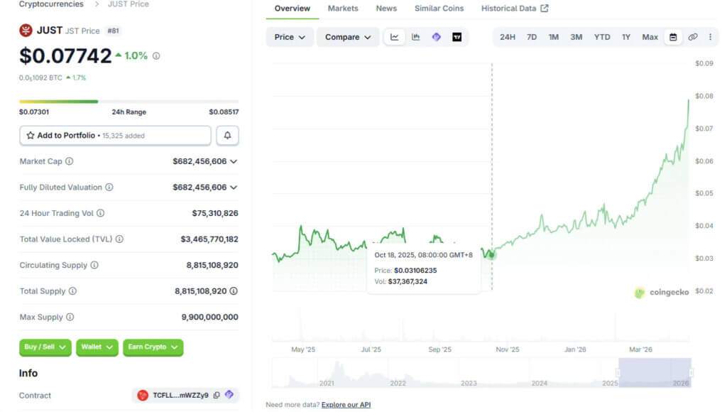JST’s market performance is another powerful validation of this deflationary logic. According to CoinGecko’s data, since the buyback program commenced in October 2025, JST’s price has surged from a low of ~$0.03 to $0.08, representing an over 100% upsurge. Over the same period, its market cap has jumped from $300 million to ~$700 million, signaling robust investor confidence. As this deflationary mechanism becomes a structural fixture of the ecosystem, the ongoing contraction of circulating supply is expected to drive JST’s valuation up in the long run.