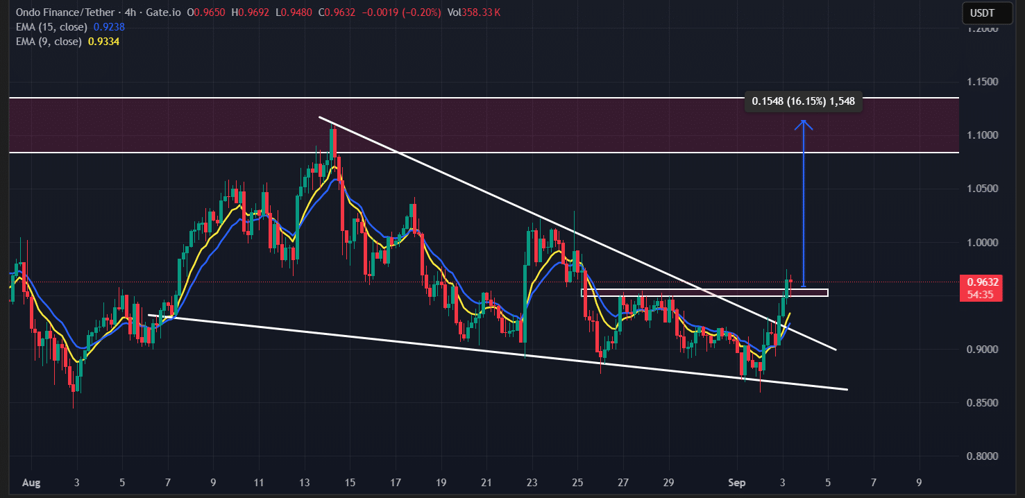On the four-hour chart, the asset has broken out of a bullish falling wedge pattern while also surpassing a key hurdle at the $0.95 level.