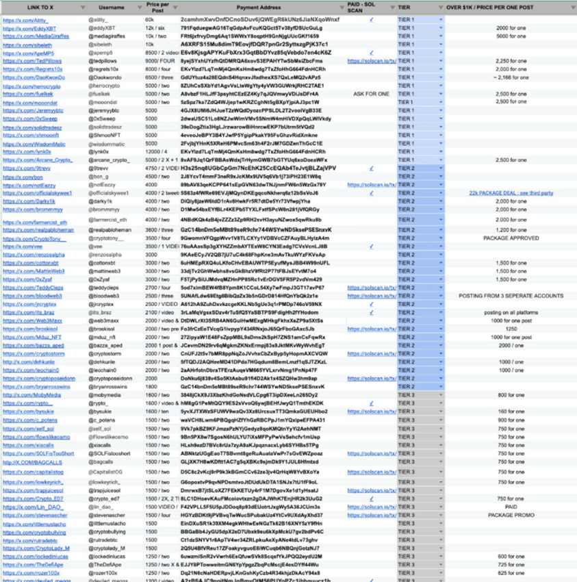 A price sheet detailing 200+ influencers’ wallet addresses and promotional deals showed that out of 160+ accounts that accepted campaigns, fewer than five disclosed their posts as advertisements.