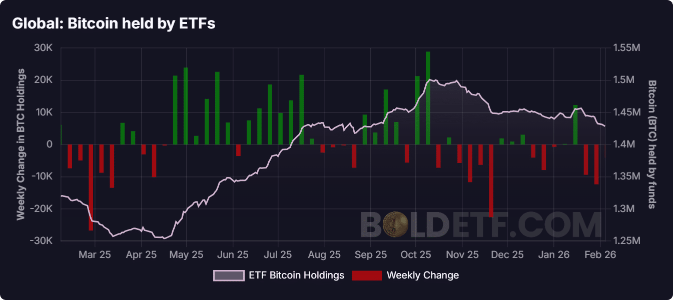 When zoomed out to the global holdings of BTC ETFs (covering offerings in the U.S, E.U., Asia, and others), the same picture emerged.