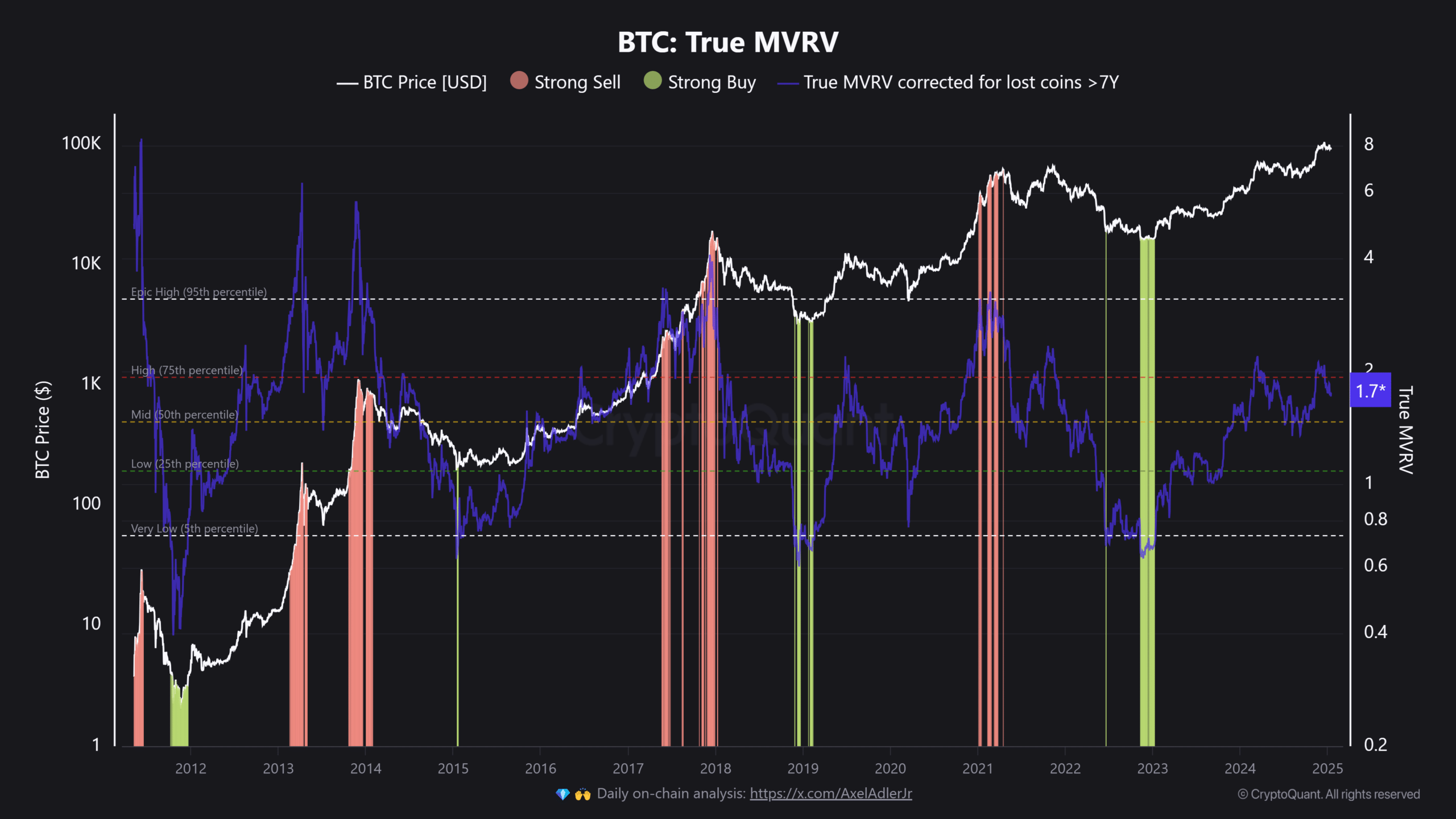 Historically, a True MVRV value of 2 marks local tops while a reading of 4 and above flags cycle tops.