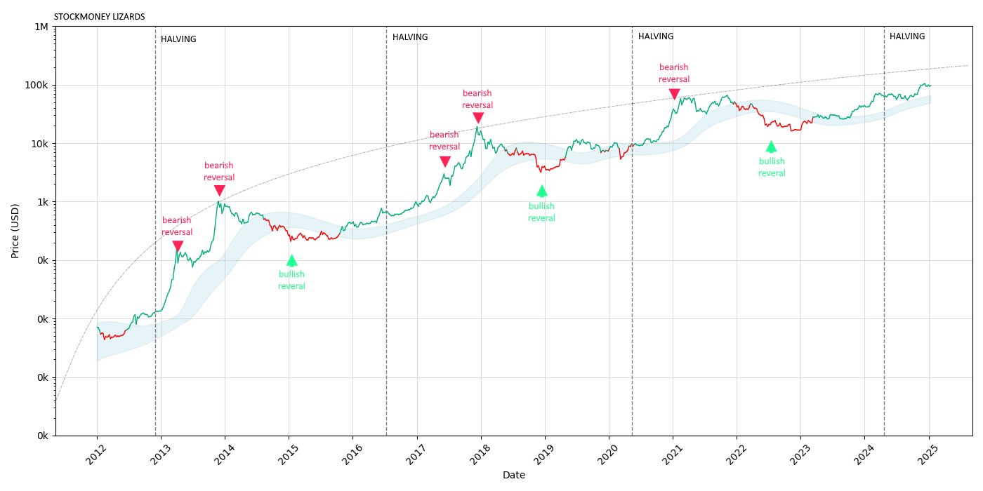 The attached chart highlighted historical RSI (red/green arrows) levels, indicating overbought (bearish reversal) and oversold (bullish reversal) conditions correlated to previous BTC cycle tops/bottoms).