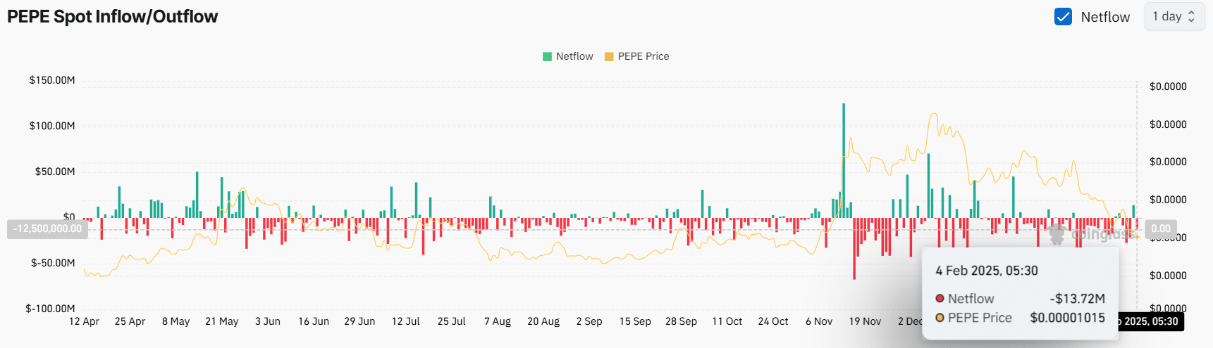 Data from the on-chain analytics firm Coinglass revealed exchanges witnessed an outflow of over $14 million worth of PEPE memecoins.