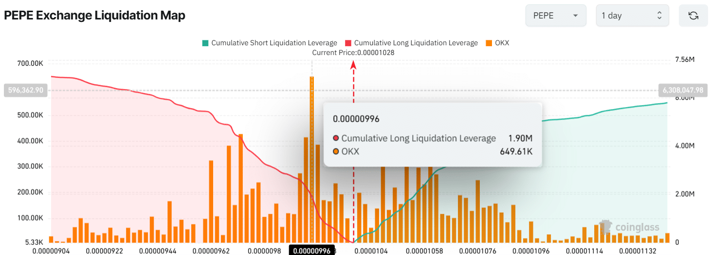 The PEPE exchange liquidation map reveals that bulls are dominating the memecoin, believing PEPE won’t fall below $0.00000996. As a result, they are over-leveraged at this level, holding $1.90 million worth of long positions.