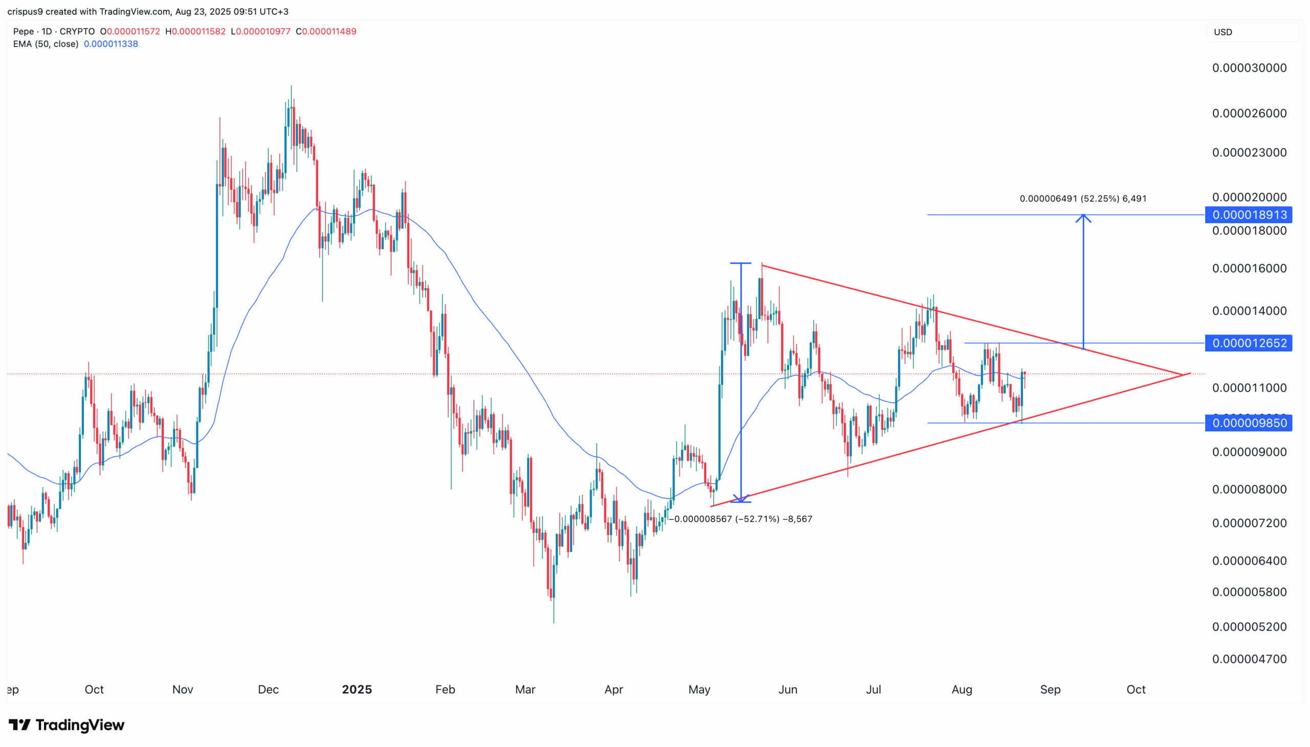 The daily timeframe shows that the Pepe Coin price formed a highly bullish double-bottom pattern at $0.000009850. It is slowly nearing its