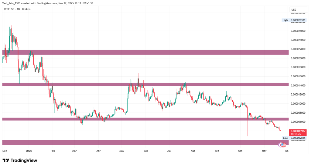 PEPE’s performance in Q3 and Q4 created weak price movements. By November, it had lost its crucial 2-year-old key support area, which was situated around $ 0.00000640-$ 0.00000710.