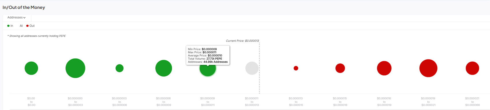 If it doesn’t, expect 27 trillion more PEPE coins, bought at $0.000009, just 27% lower than its current value, to shift into the red, putting $243 million at risk of a sell-off.