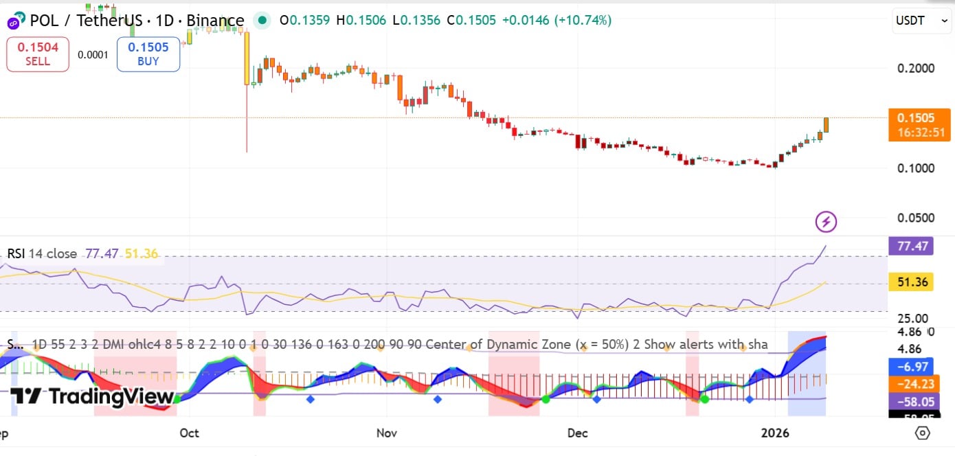 The rally pushed POL to $0.151, a level last seen in November, effectively erasing all of December’s losses. At the time of writing, the token was trading at $0.1505, up 18.12% on the daily charts.