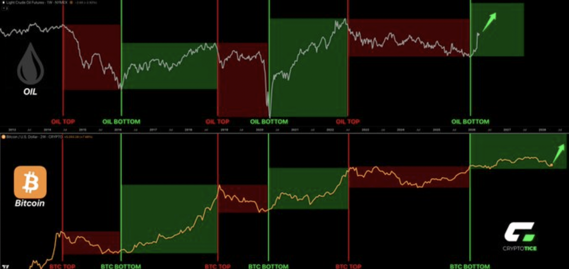 Every single Bitcoin parabolic phase in history was preceded by an oil bottom.