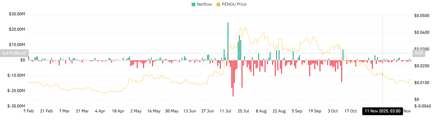 However, if whales continue selling, the memecoin could see all recent gains erased as PENGU retraces, breaching $0.01 support and falling to $0.0095.
