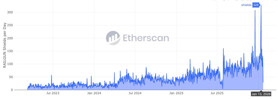 In fact, the number of shields per day for tracking private wallets has been rising sharply since 2025. In early 2026, the daily average shield hit a record high of 326, further confirming the massive demand for privacy.